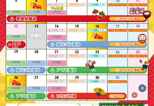令和8年1月のイベントカレンダーです! 1月1日から毎年恒例、『年賀タオル』を販売いたします。 今回の干支は午(うま)です! 無くなり次第、販売終了となりますのでお早めにお求めくださいませ~ また1日~12日まで『年賀...