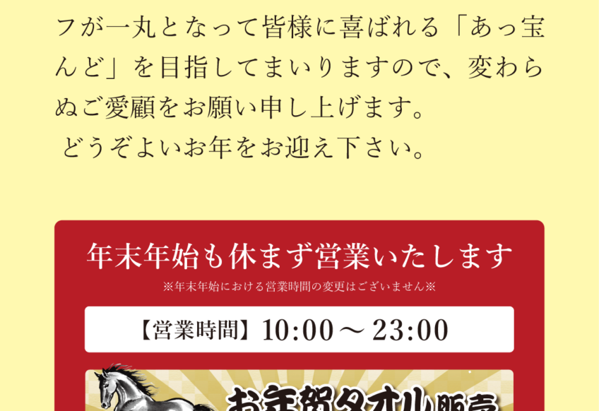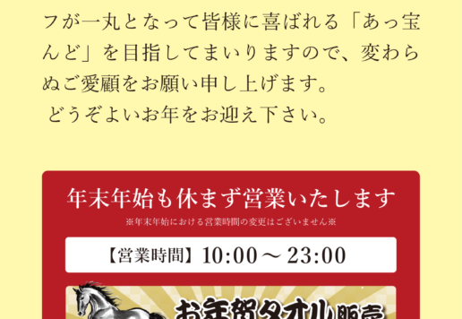 本年もたくさんの皆様にご愛顧賜りまして、誠にありがとうございました! あっ宝んどは、年末年始も休まず通常営業いたします。 1年の入り納めに、新年の入り初めに、どうぞ皆様お誘いあわせでお越し下さいませ。