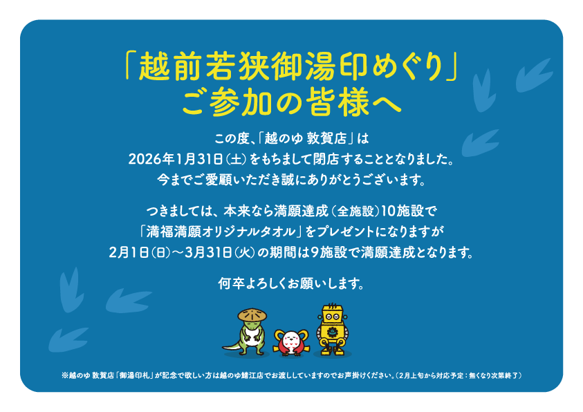 また、越のゆ敦賀店の「御湯印札」が記念で欲しいという方には越のゆ鯖江店にてお渡しいたしますので、お気軽にお声掛けください。(令和8年2月上旬から対応予定・無くなり次第終了)【追記 2025.12.26】