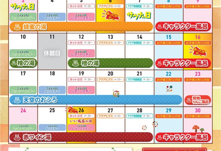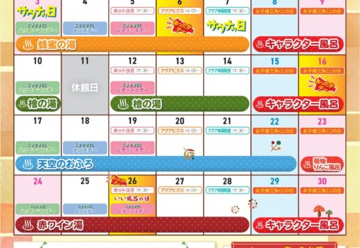 令和7年11月イベントカレンダー出来上がりました。 17(月)~22(土)は『天空のおふろ』 大野城を焼印した杉板が白いお風呂に浮かびまさに天空のお風呂!! 23(日)は現物『りんご風呂』 りんごがぷかぷかと浮かんだか...