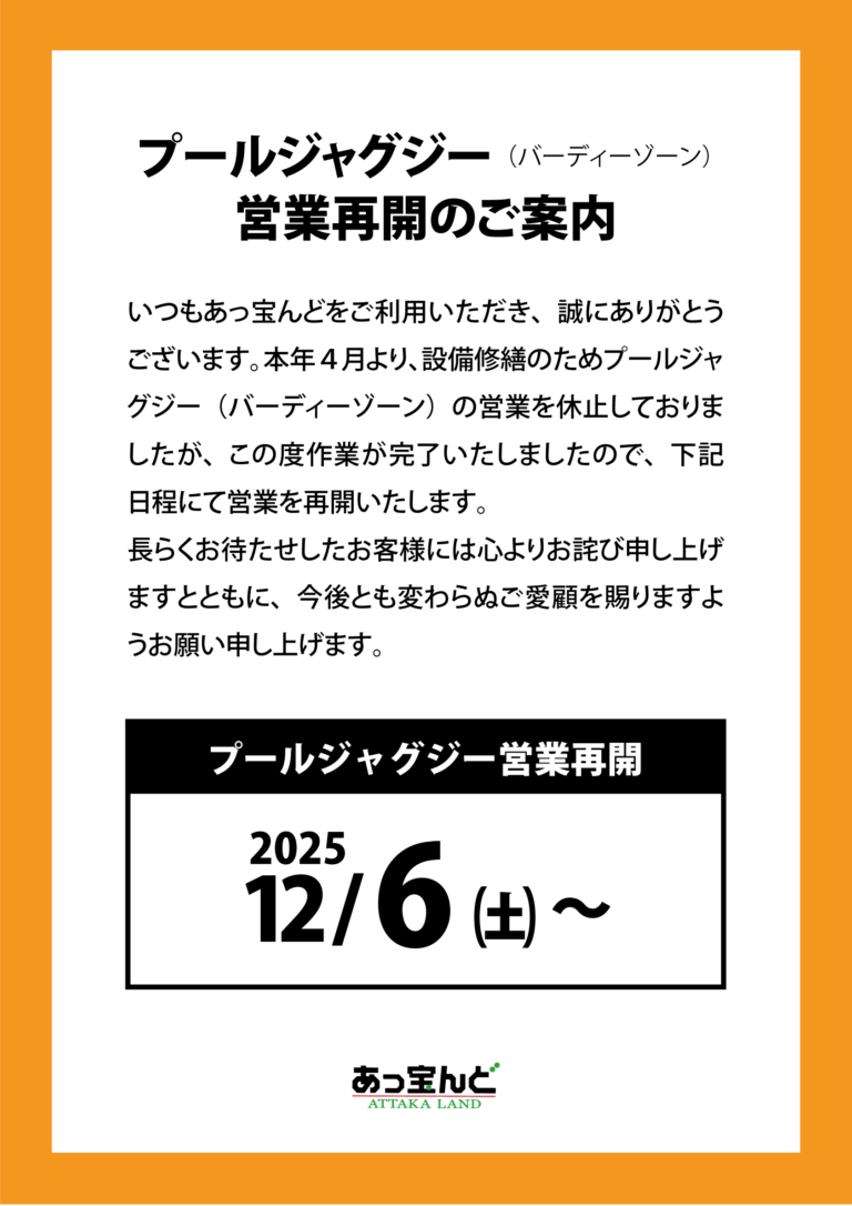 プールジャグジー営業再開のおしらせ 2025.12.06 Tweet Share 長らくお時間を頂いておりました、プール内ジャグジーの修繕工事が完了いたしました! 本日12月6日より正式に営業を再開いたしました!! みなさまには大変なご不便・ご迷惑をお掛け致しまして、申し訳ございませんでした。 みなさまのご利用をお待ちしております。 Tweet Share