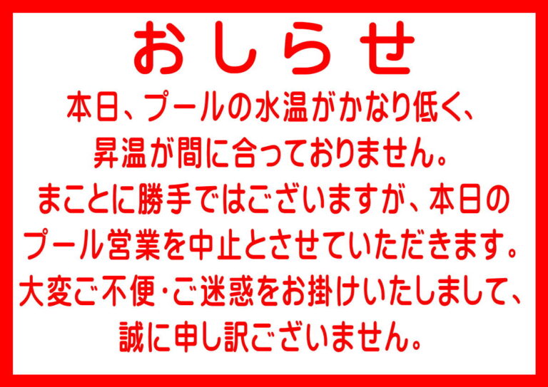 現在、プール水の昇温が間に合っておらず水温が低い状態のため、まことに勝手ながら、本日のプール営業を中止とさせていただきます。