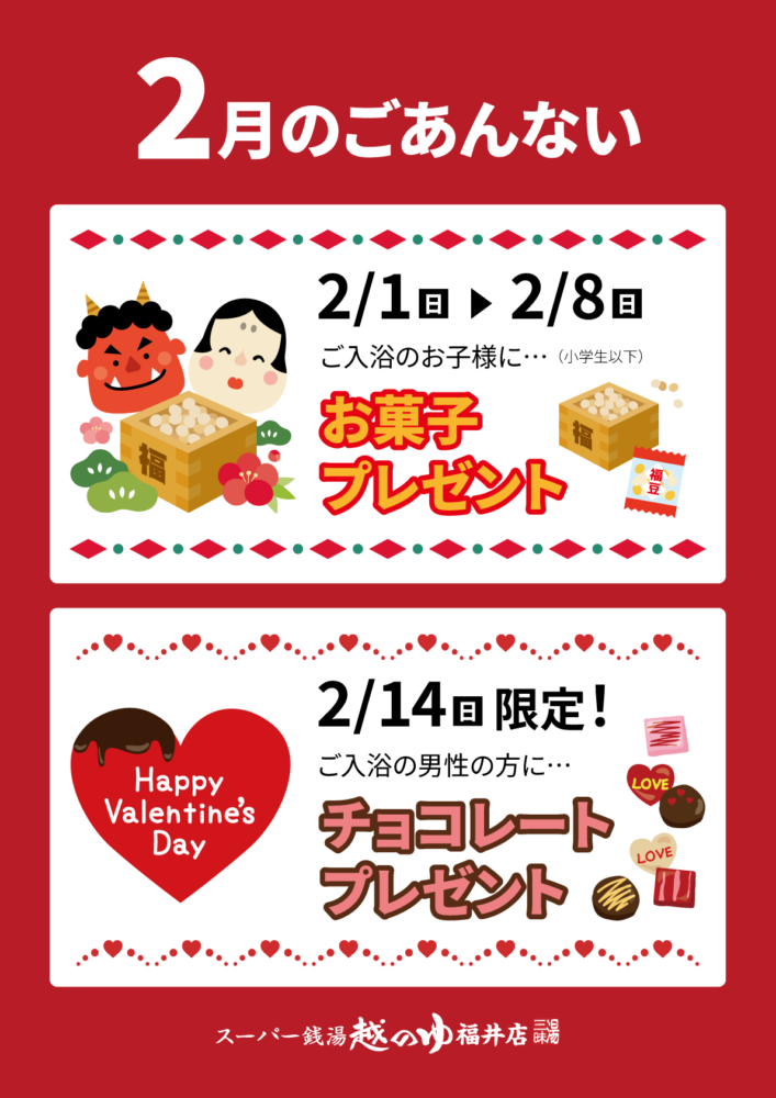 ホーム お知らせ バレンタインデー バレンタインデー 本日2/14は 💗 Happy Valentine’s Day 💗 ご来店頂いた男性の方全員にチョコを プレゼントいたします(*^v^*)! 皆様のご来店お待ちしています♡ 関連するお知らせ 8月イベントカレンダー 3月イベントカレンダー 6月実施イベントのお知らせ お食事処よりお知らせ 「検温」のお願い