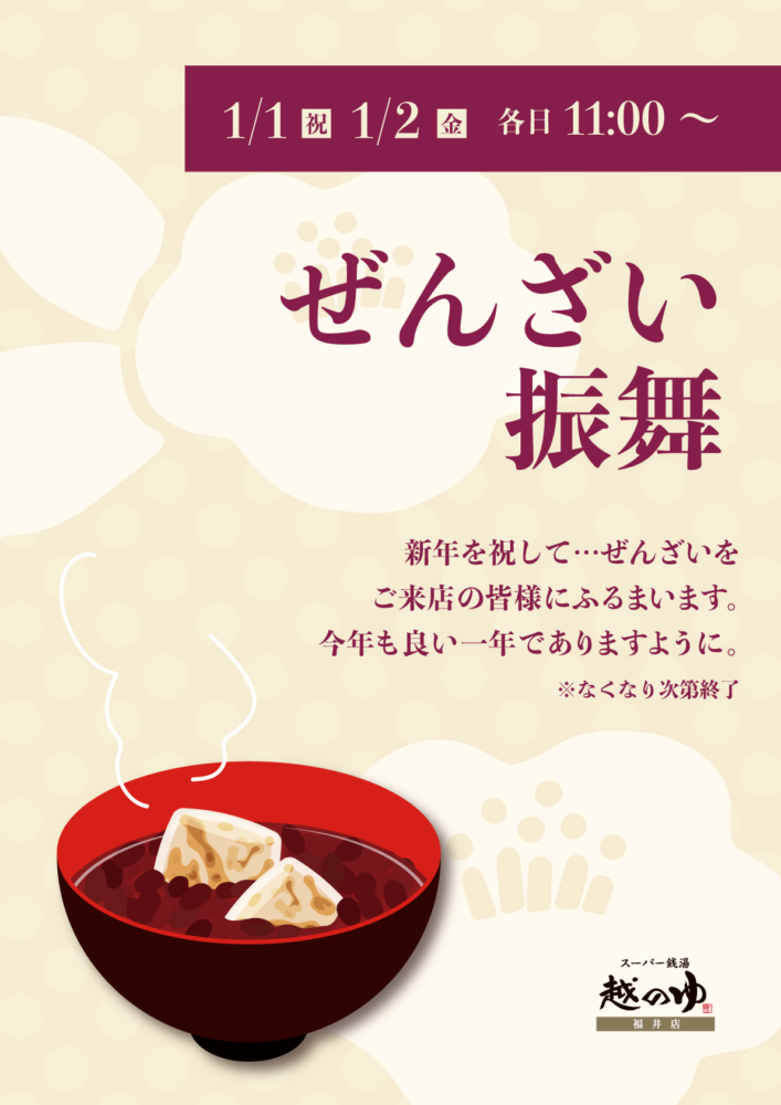 ホーム お知らせ ぜんざいふるまい ぜんざいふるまい 1月1日、2日の2日間、 11時よりレストラン越麺庵にてぜんざいふるまいを開催します! 各日先着100名様分ご用意致します。 数に限りがございますので先着順で 無くなり次第終了とさせて頂きます。 皆様のご来店お待ちしております! 関連するお知らせ はっぴーすマンとのコラボメニュー販売決定! 年末年始営業時間のお知らせ オンラインショップ開設のお知らせ 5月イベントカレンダー パンダ湯のお知らせ