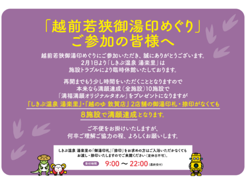 現在越のゆグループで実施中の「越前若狭御湯印めぐり」にたくさんのご参加をいただき、誠にありがとうございます。令和8年2月1日より、しきぶ温泉湯楽里(福井県越前市)は施設トラブルにより臨時休業いたしております。 再開までも...