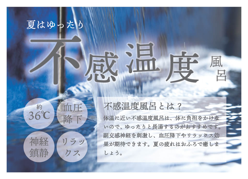 ホーム 越のゆ鯖江店 > イベント > 2024.6.28 不感温度風呂開催 2024.6.28 不感温度風呂開催 明日6月29日よりスタート 越のゆ鯖江の夏といえば・・・ そう『不感温度風呂』‼️ 本来7月からスタート予定でしたが、先行スタートして明日29日より開催します✌️ 36℃のぬるめのお湯でリラックスしちゃおう🥰 関連投稿: 五塔熱子さん再び!!! 10月1発目!!! アウフグースイベント! 1月カレンダー