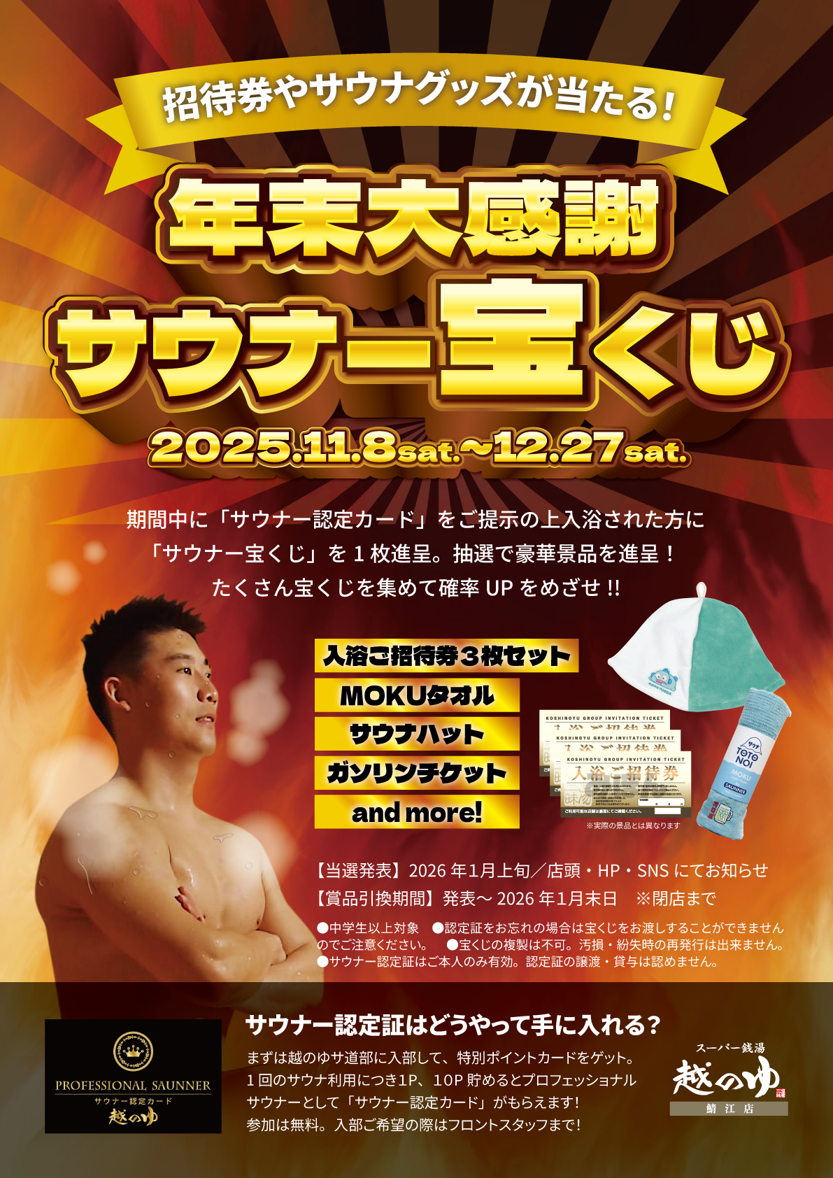 ホーム 越のゆ鯖江店 > イベント > 2025.11.8 年末大感謝サウナー宝くじ 2025.11.8 年末大感謝サウナー宝くじ 年末大感謝サウナー宝くじ‼ 11/8~12/27までの間サウナー認定証のご提示で『サイナー宝くじ』を配布!たくさん集めて豪華賞品の確率アップを目指そう✌ 当選発表は1月上旬を予定しております。 サウナを楽しみながら宝くじをじゃんじゃん集めちゃおう☺ 関連投稿: 8月カレンダー 3月オートロウリュ&アウフグースカレンダー 銭湯の日リベンジ 2025.1癒しどころお得なパック