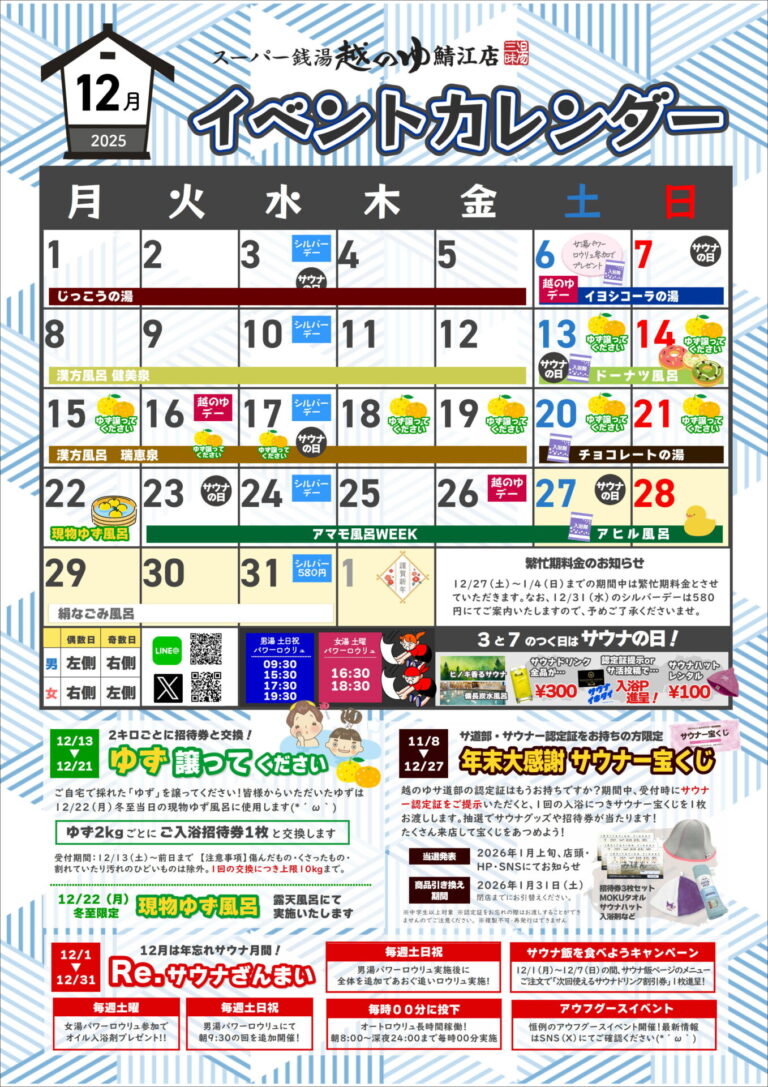 12月は大人気サウナざんまいに、ゆずを譲ってください、そして越のゆグループ限定のお風呂アマモ風呂WEEKを実施いたします。