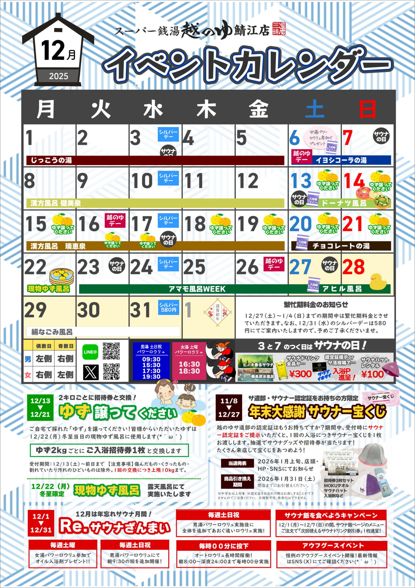 こんばんは越のゆ鯖江店です12月のカレンダーが完成しました!