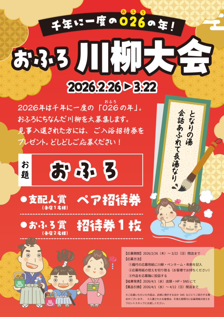 ホーム 越のゆ鯖江店 > イベント > 2026.02.26 お風呂川柳大募集 2026.02.26 お風呂川柳大募集 【お風呂川柳大募集!】今年は2026年でお風呂の年!2/26~3/22までに期間中に『おふろ』をテーマにした川柳をお寄せください頂いた川柳を店舗に掲示するほか選ばれた作品には『招待券』を進呈いたします!たくさんのご応募待ってまーす 関連投稿: 12月カレンダー 北陸名湯めぐり! 2025.5.01 5月イベントカレンダー 2025.12 年末年始繁忙期のお知らせ