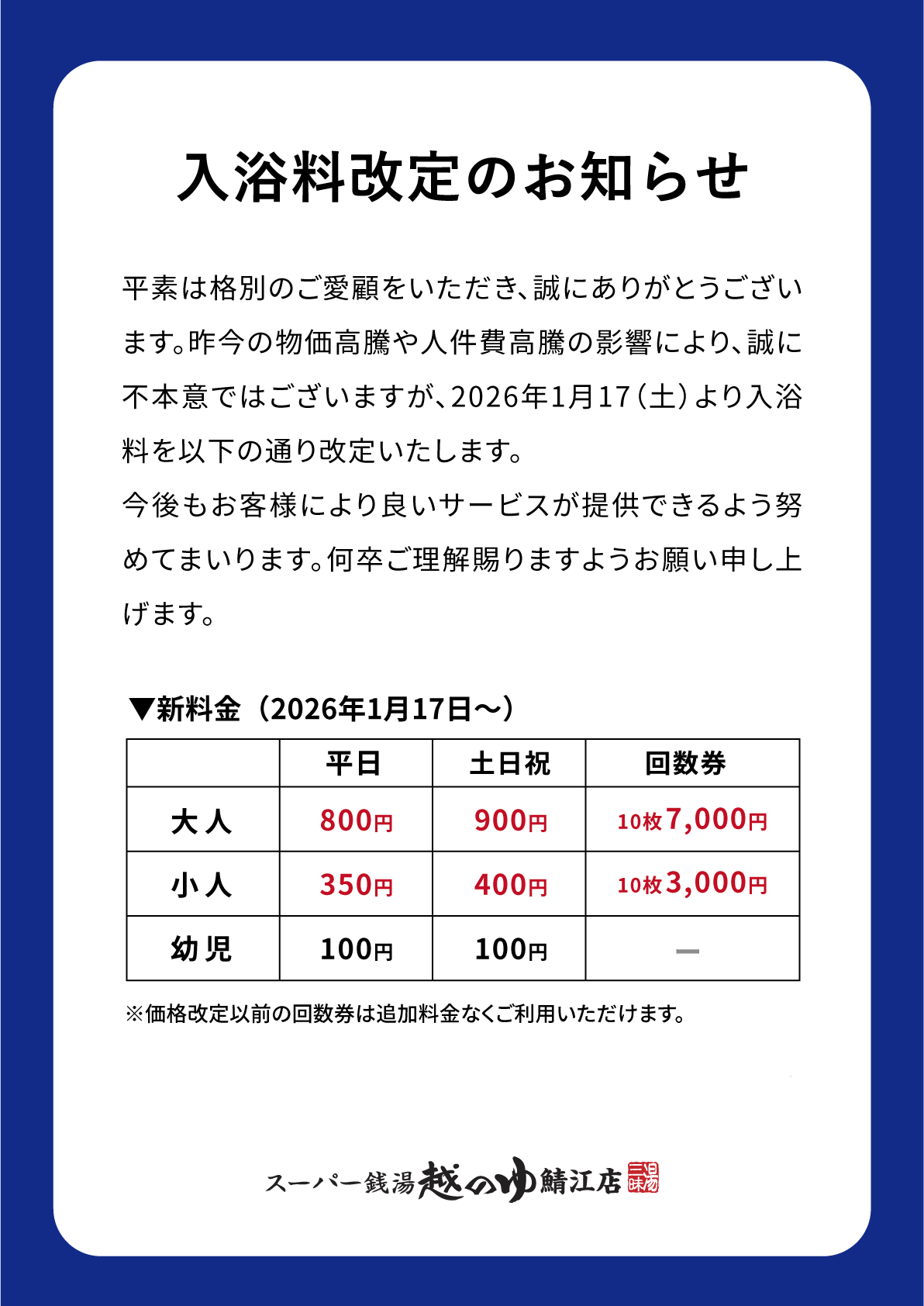 ホーム 越のゆ鯖江店 > お知らせ > 2026.1.17 入浴料改定について 2026.1.17 入浴料改定について 【入浴料改定のお知らせ】 いつも越のゆ鯖江店をご利用頂き誠にありがとうございます。昨今の物価高騰や人件費の高騰の影響により誠に不本意ではございますが、2026年1月17日(土)より入浴料の改定させていただきます。何卒ご理解賜りますようお願い申し上げます。 関連投稿: 川柳入選者発表! 夏メニューのご紹介! 高温サウナ修理完了のおしらせ 10月1発目!!!