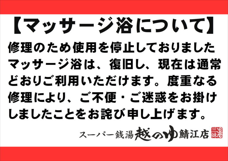 ホーム 越のゆ鯖江店 > お知らせ > 修理のため使用を停止しておりましたマッサージ浴は、復旧し、現在は通常どおりご利用いただけます。 度重なる修理により、ご不便・ご迷惑をお掛けしましたことをお詫び申し上げます。 関連投稿: テイクアウトのご案内 オンラインショップを開設しました! 越のゆ鯖江店もツイッタ―はじめました。 6月カレンダー