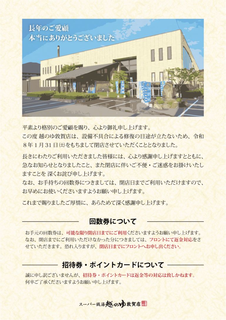 ホーム 越のゆ敦賀店 > イベント > 【越のゆ敦賀店 閉店のお知らせ】 【越のゆ敦賀店 閉店のお知らせ】 回数券に関して 回数券は閉店までのご使用いただきますようお願いいたします。なお、使用できなかった分の払い戻しは2026年1月31日(土)までとなります。 また、2025年12月25日以降にご購入される方の有効期限は2026年1月31日(土)までとなりますのでご購入の際はご注意ください。 関連投稿: 10月イベントカレンダー 10/10は銭湯の日!縁日も開催! 【初出展】全国サウナ物産展2025 12月イベントカレンダー